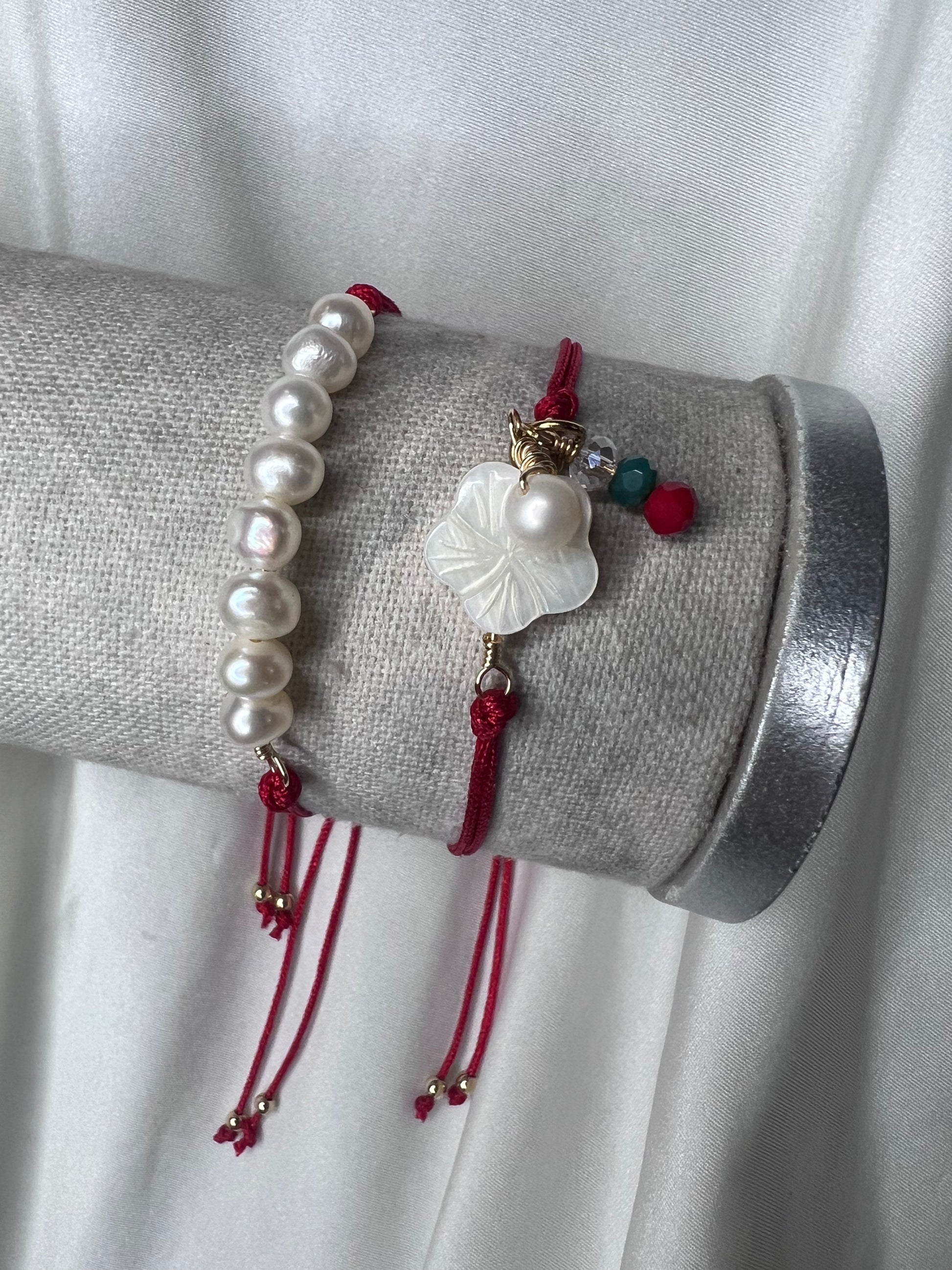 Hermoso set de pulsera ajustable. Piedras de agua dulce y flor de nácar. Bella y delicada como una flor.